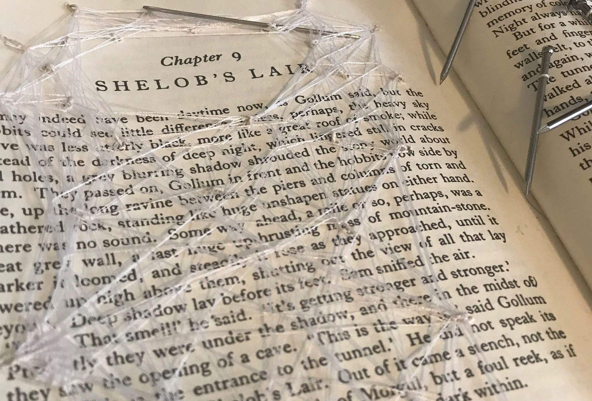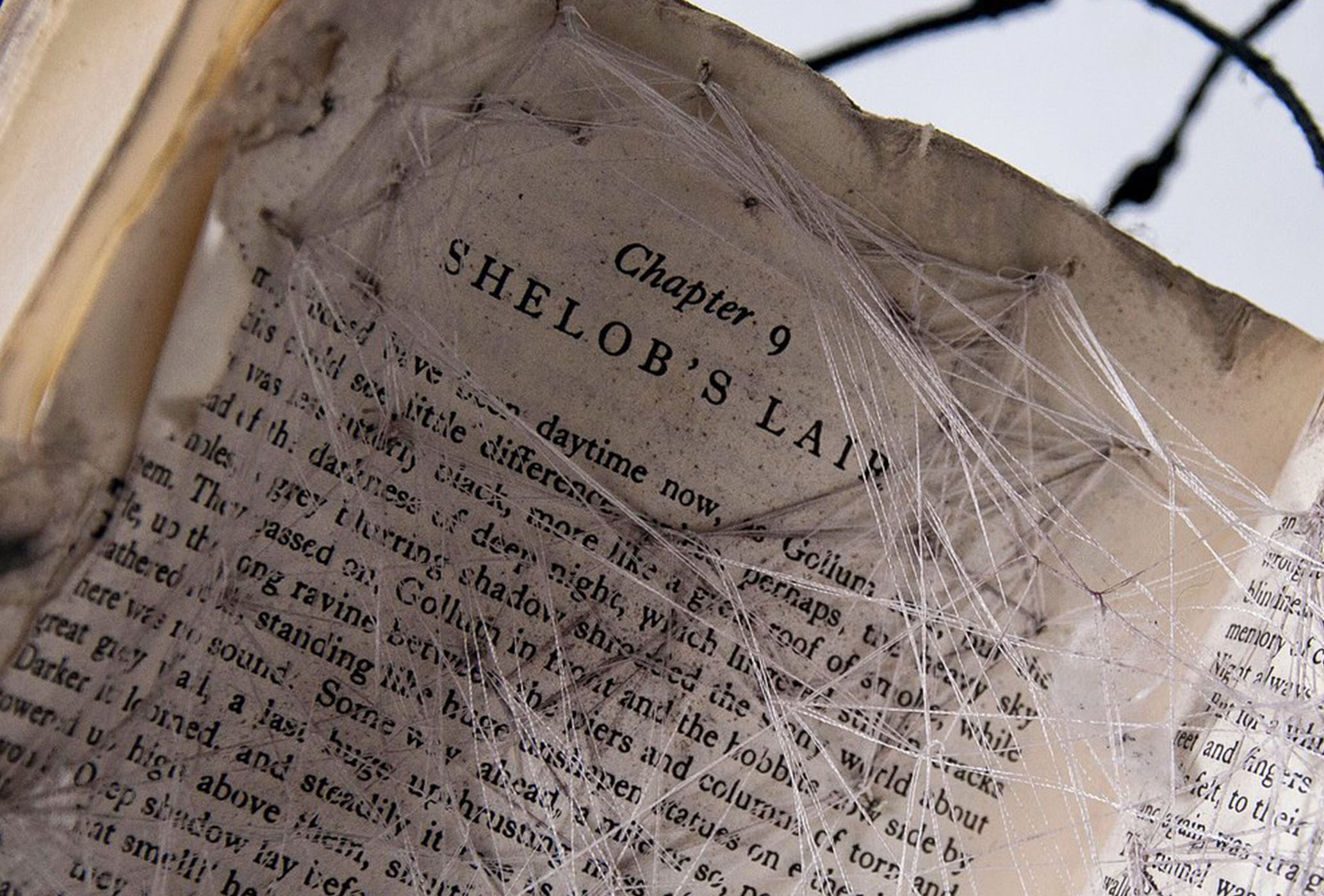 For the book portion of the sculpture, I stitched the chapter title page to its facing page using an excessive amount of thin white thread, creating an intricate web-like effect that emphasized the chapter’s significance. To heighten the sense of age and abandonment, I crushed pastels into dust, giving the webbing and pages a timeworn, decayed appearance. As a final unsettling touch, a tiny, bound ‘Frodo’ hung helplessly within Shelob’s grasp, trapped in her silken threads.