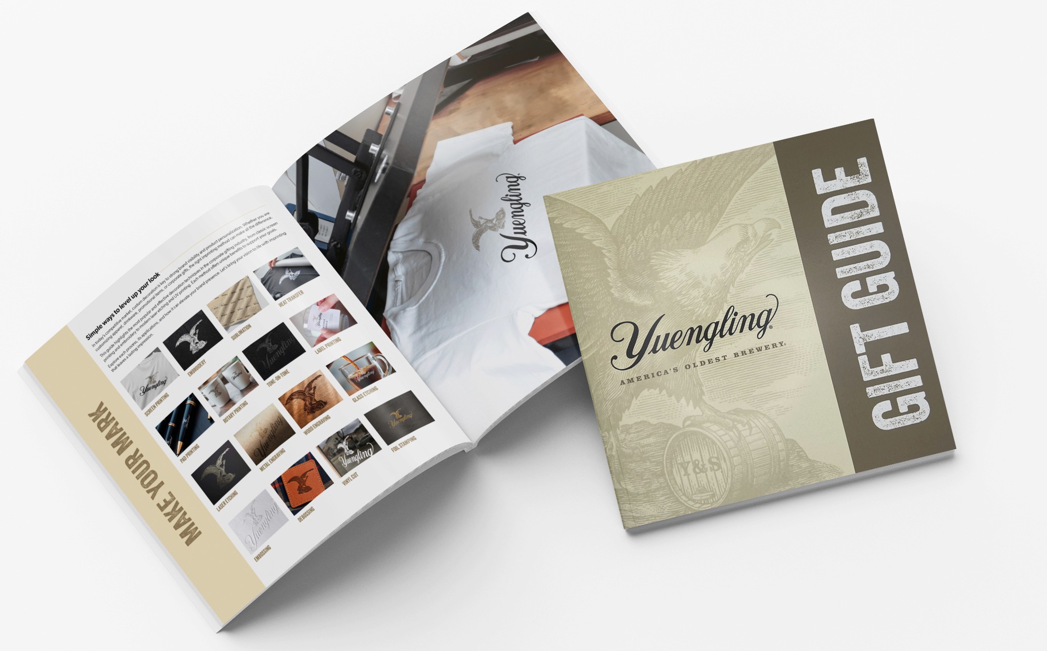 This guidebook went beyond simply listing available items. It featured a tailored selection of products informed by direct conversations with Yuengling’s marketing team, ensuring every piece aligned with their brand identity and campaign goals. To bridge the gap between concept and execution, we created custom mockups that visualized how each product could be uniquely designed for their audience while transforming abstract ideas into tangible, compelling deliverables.